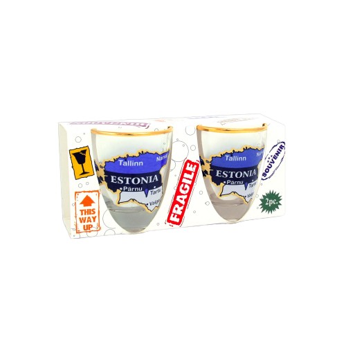 Dviejų stiklinių taurelių komplektas Estonia. Taurelės dekoruotos auksu, supakuotos originalioje dviejų taurelių pakuotėje.